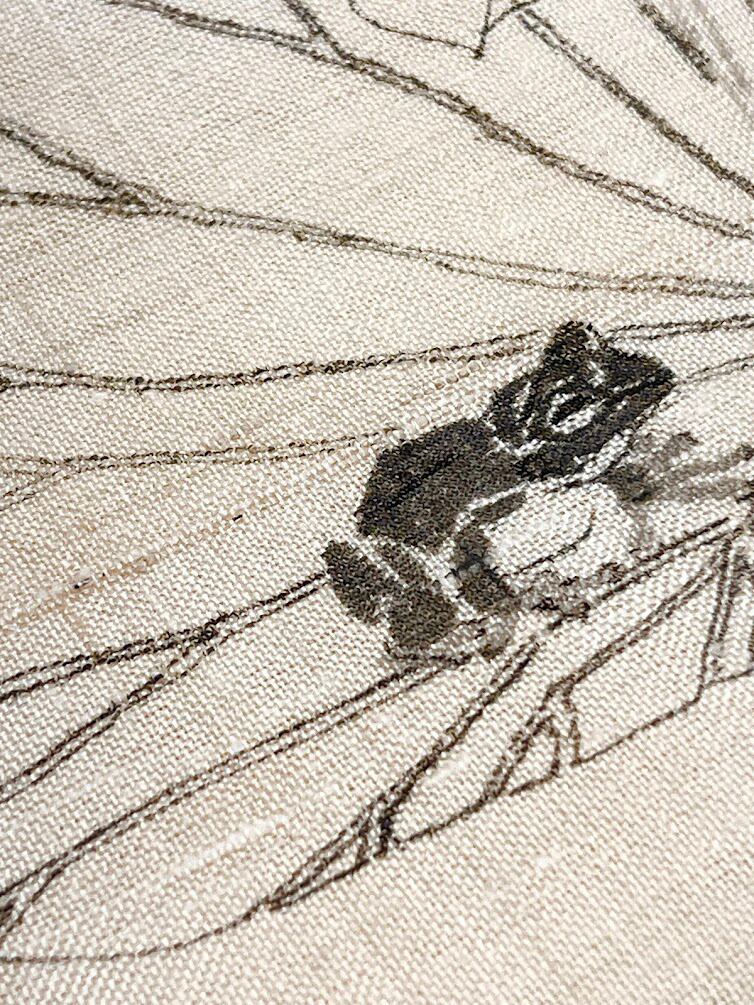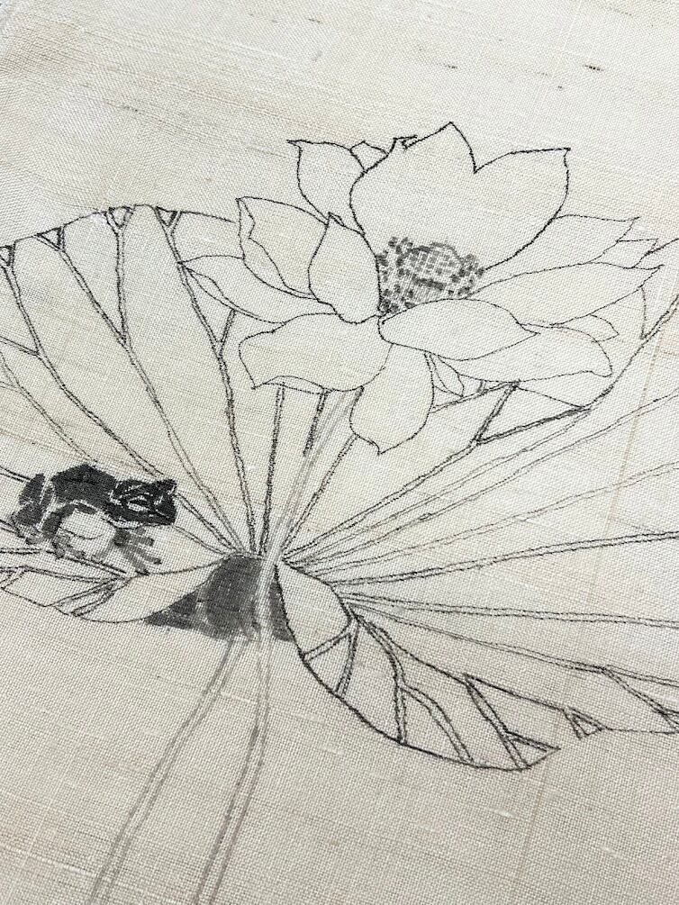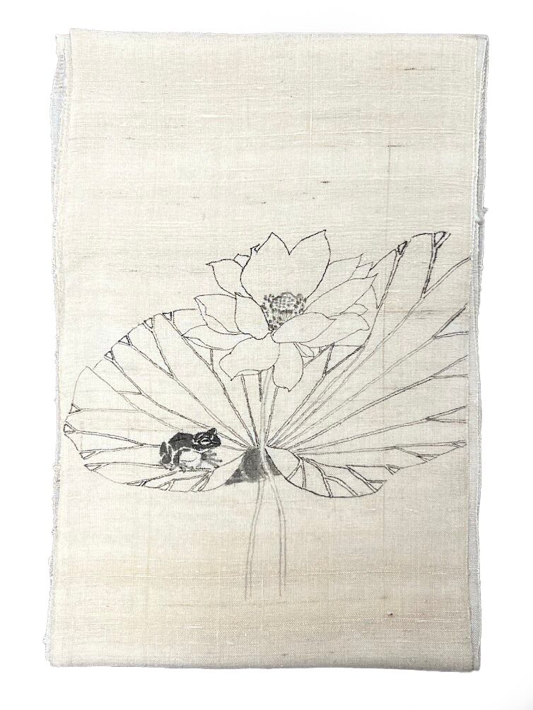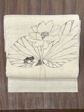 生紬の八寸帯(仕立て上がり) 石塚智之:蓮にカエル 生成り