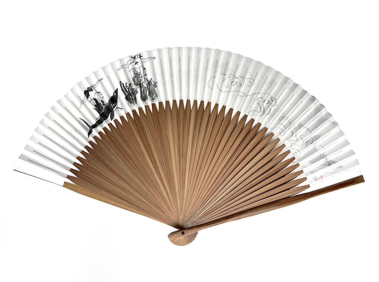 恵比寿様が乘る龍の神輿を海の生き物たちが引く楽しい絵柄の扇子です。