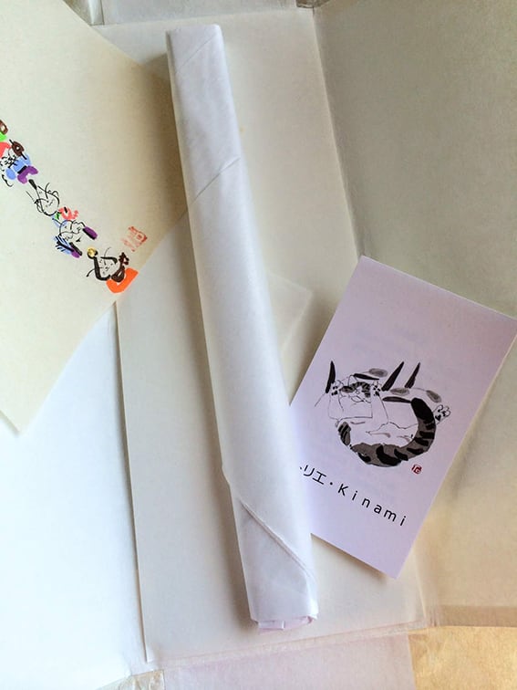扇子用のたとう紙に手描きの掛け紙を掛けてお届けいたします。