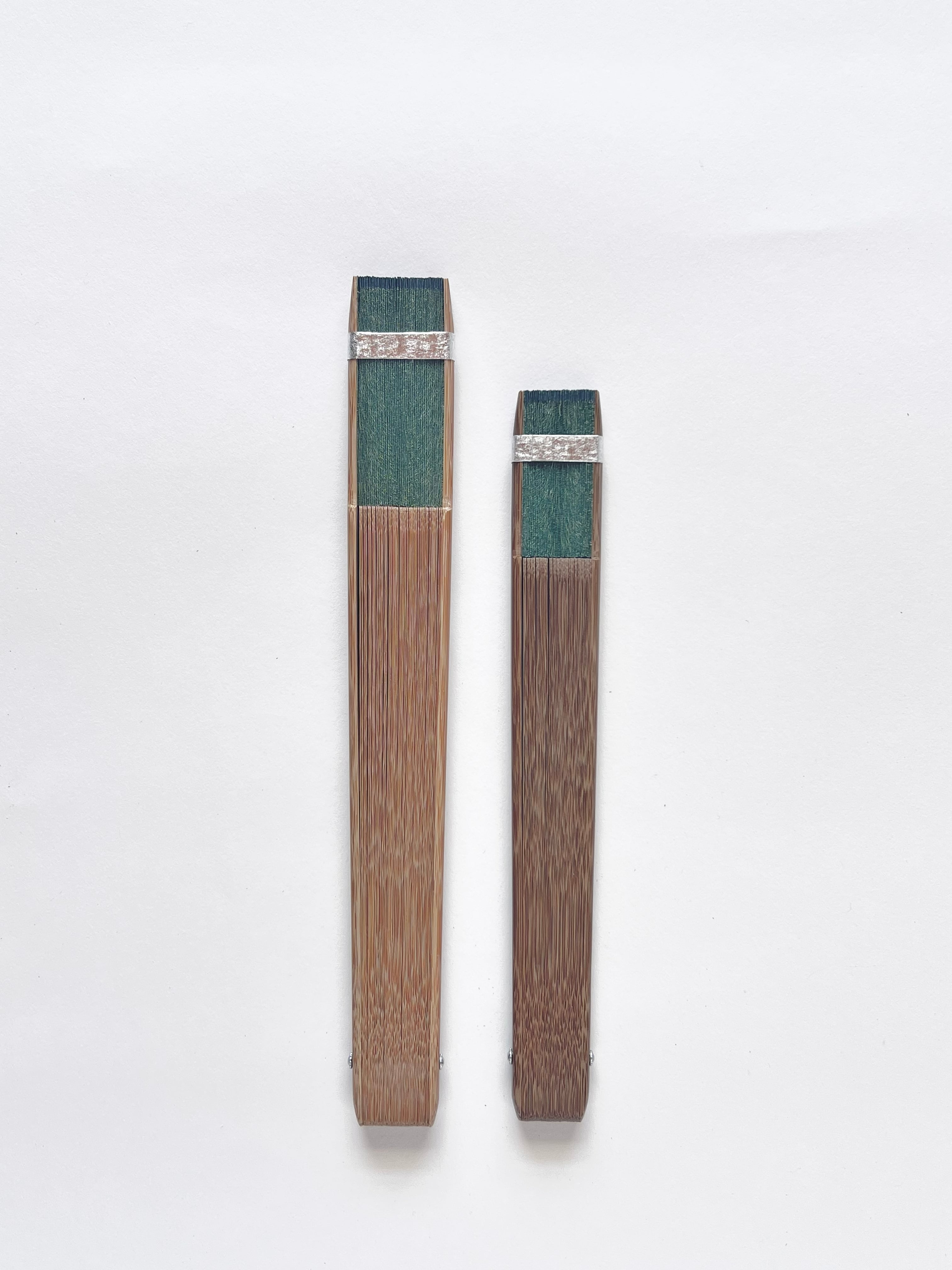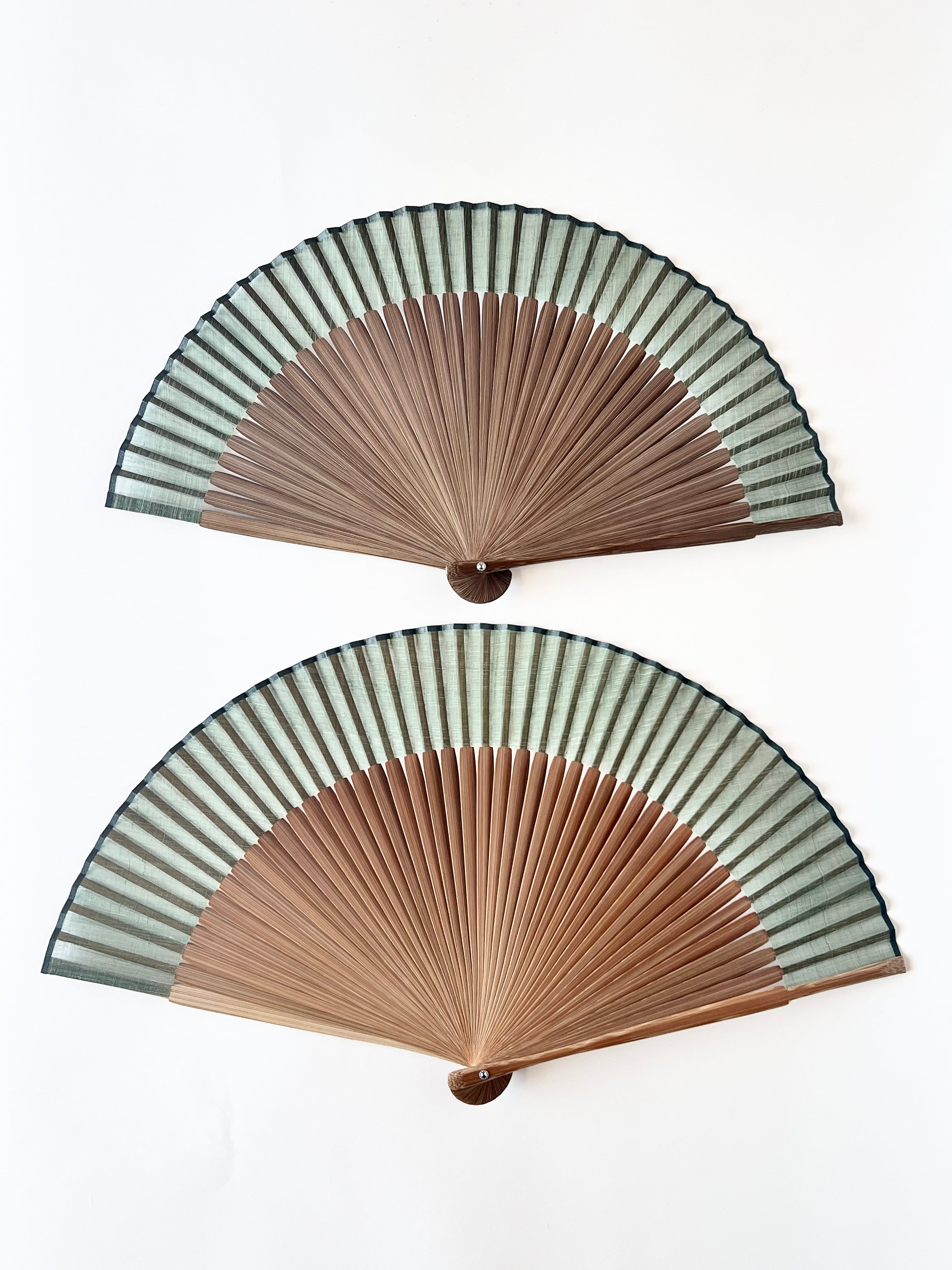 パイナップルの葉の繊維を取り出し糸にして手織りされた生地、ピーニャを扇面に使用して骨の数が多く扇面の幅が短い大短地の扇子に仕立てました。