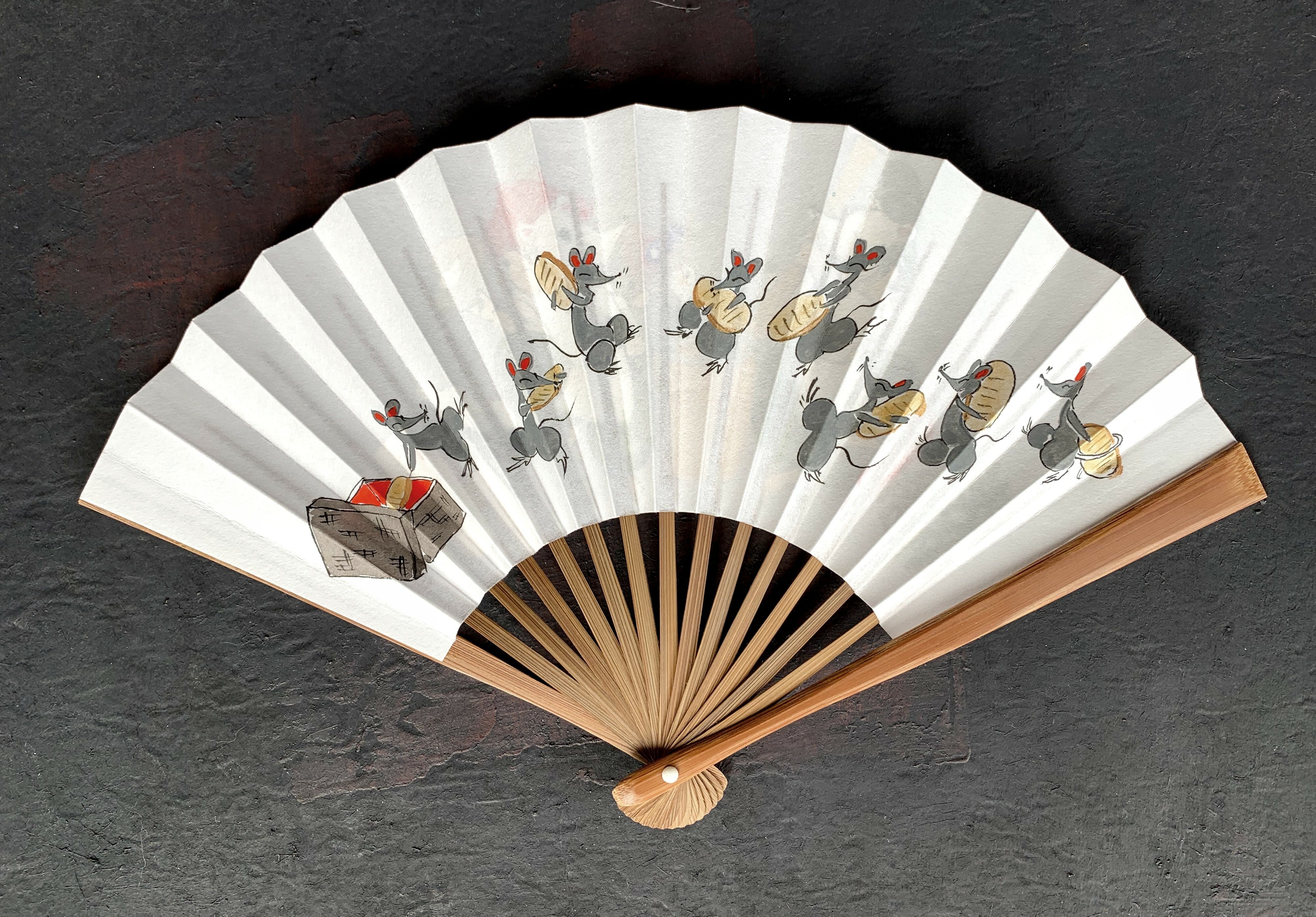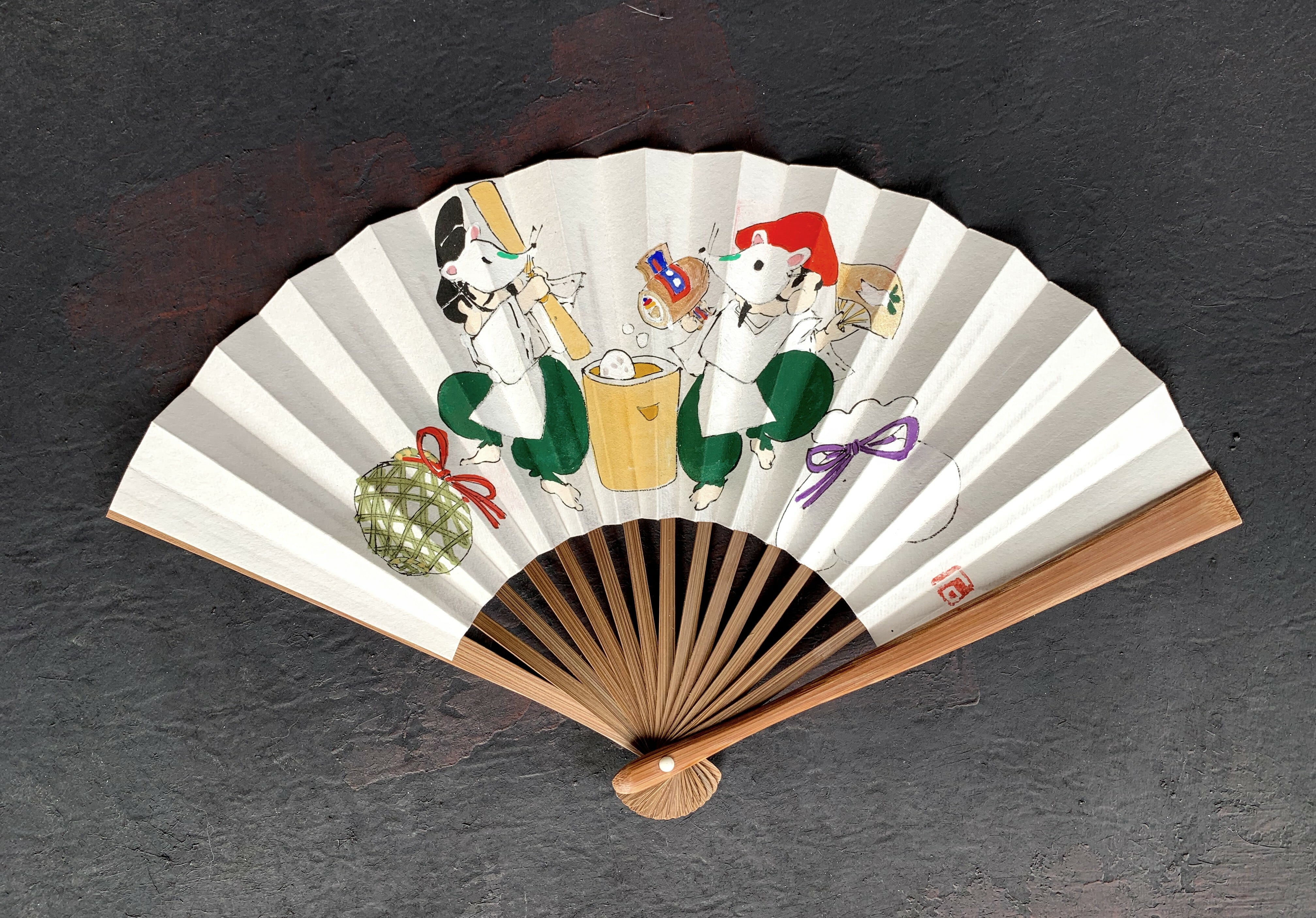 お正月に向けて、恵比寿さんと大黒さんがネズミのお面でお餅つきの扇子が出来ました。