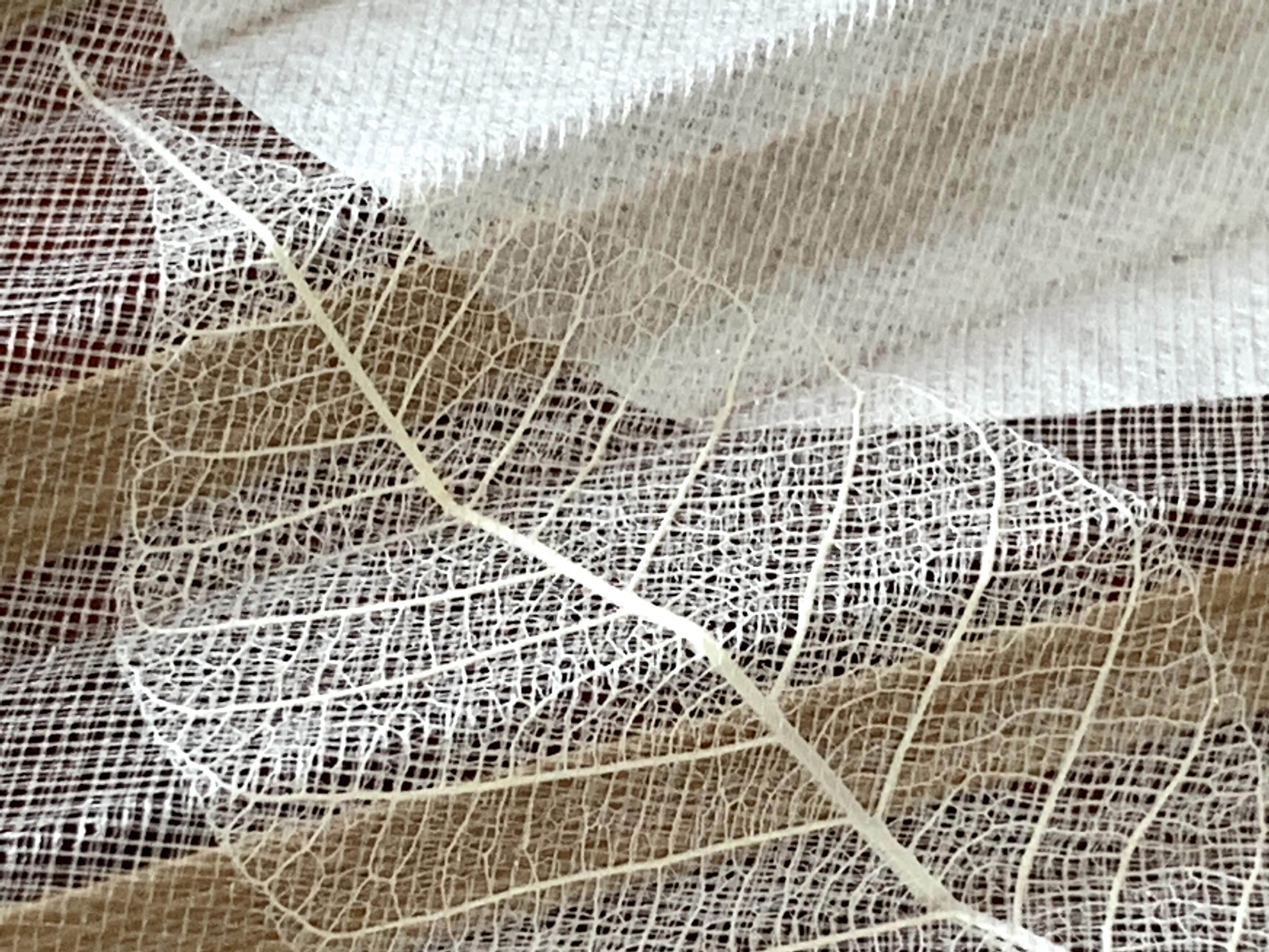 薄絹(2匁羽二重)を2枚に合わせた間に小さな葉の葉脈と和紙の切り絵を挟みました。