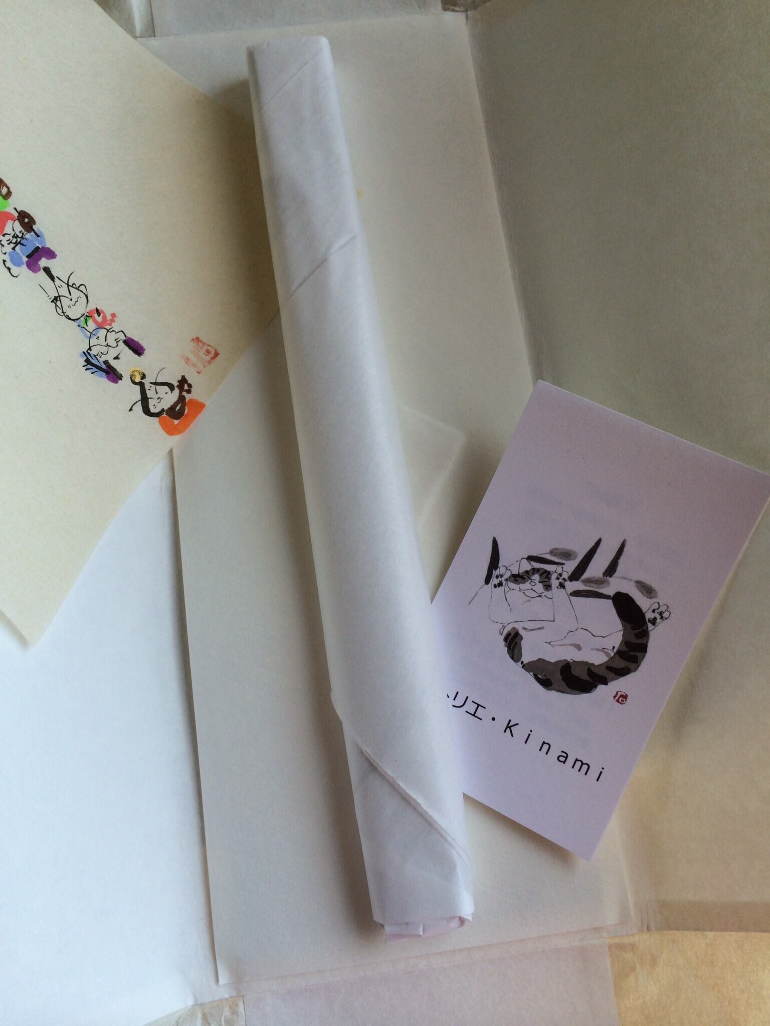 扇子用のたとう紙に手描きの掛け紙を掛けてお届けいたします。