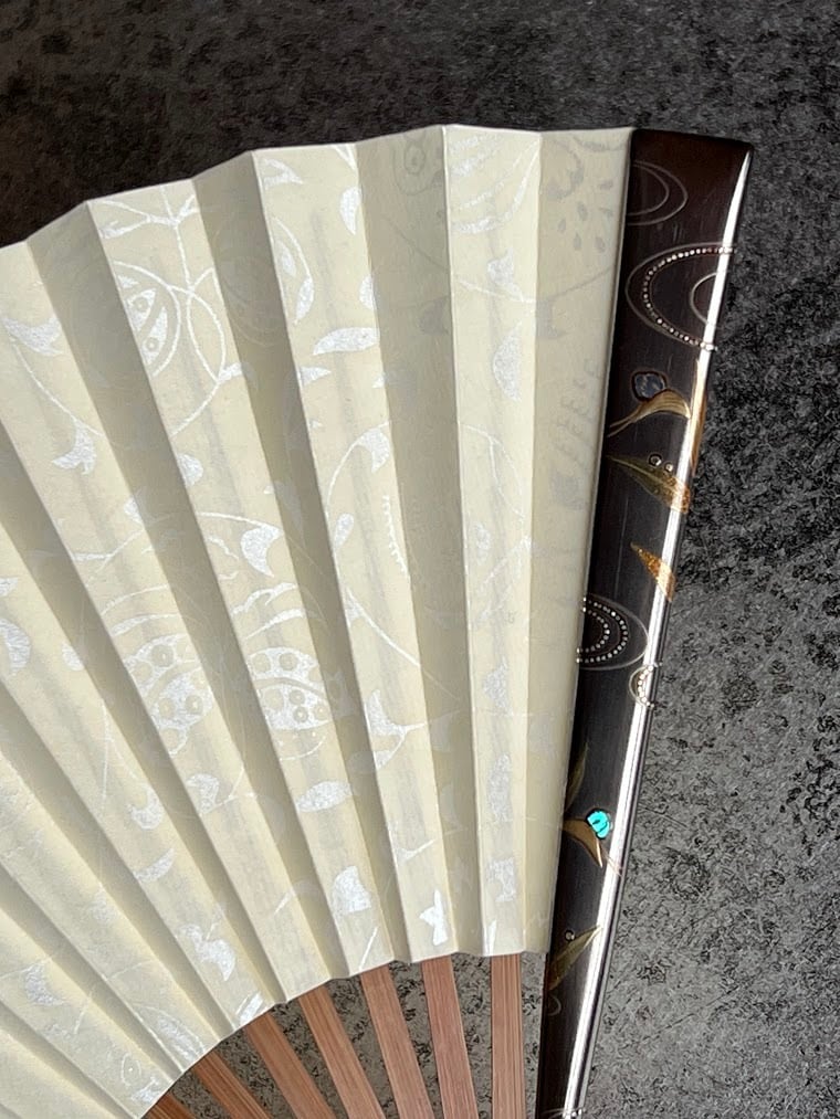 銀に塗った骨に青貝の小さな粒を花に見立てた蒔絵を施して親骨にしてあります。