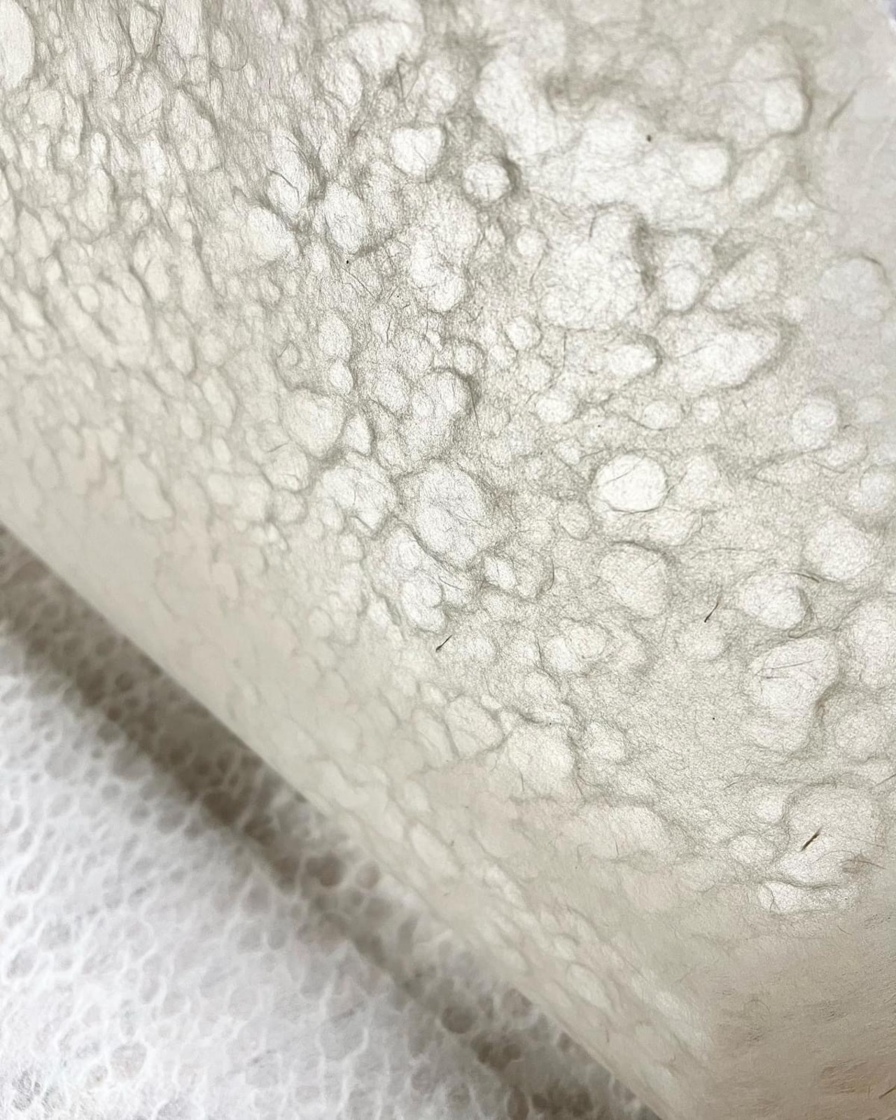 落水紙は手漉きの楮を漉く際、簾の上で濡れている時に上からシャワーの様に水をかけ、水圧で繊維が寄って模様になる加工をした紙です。